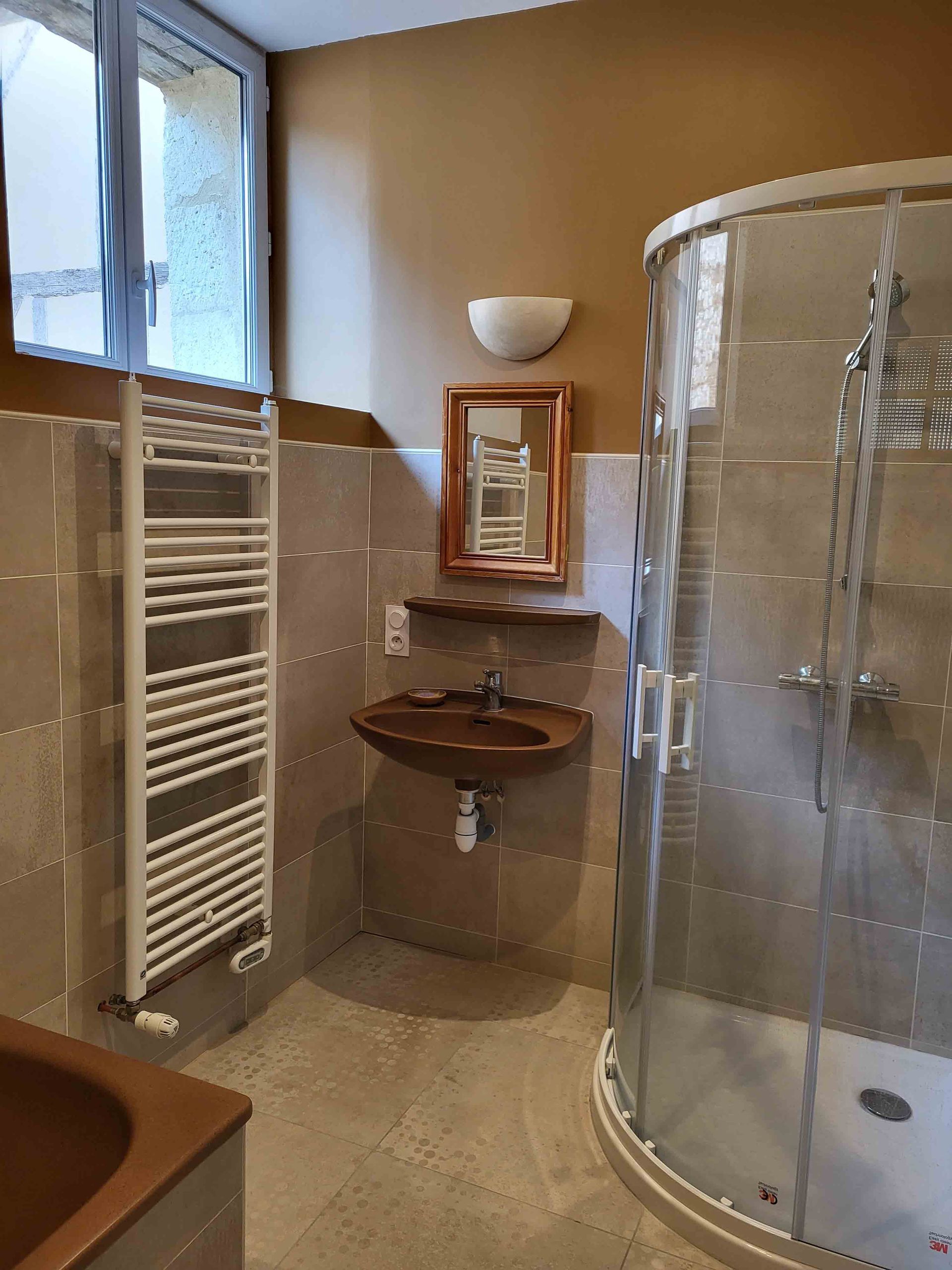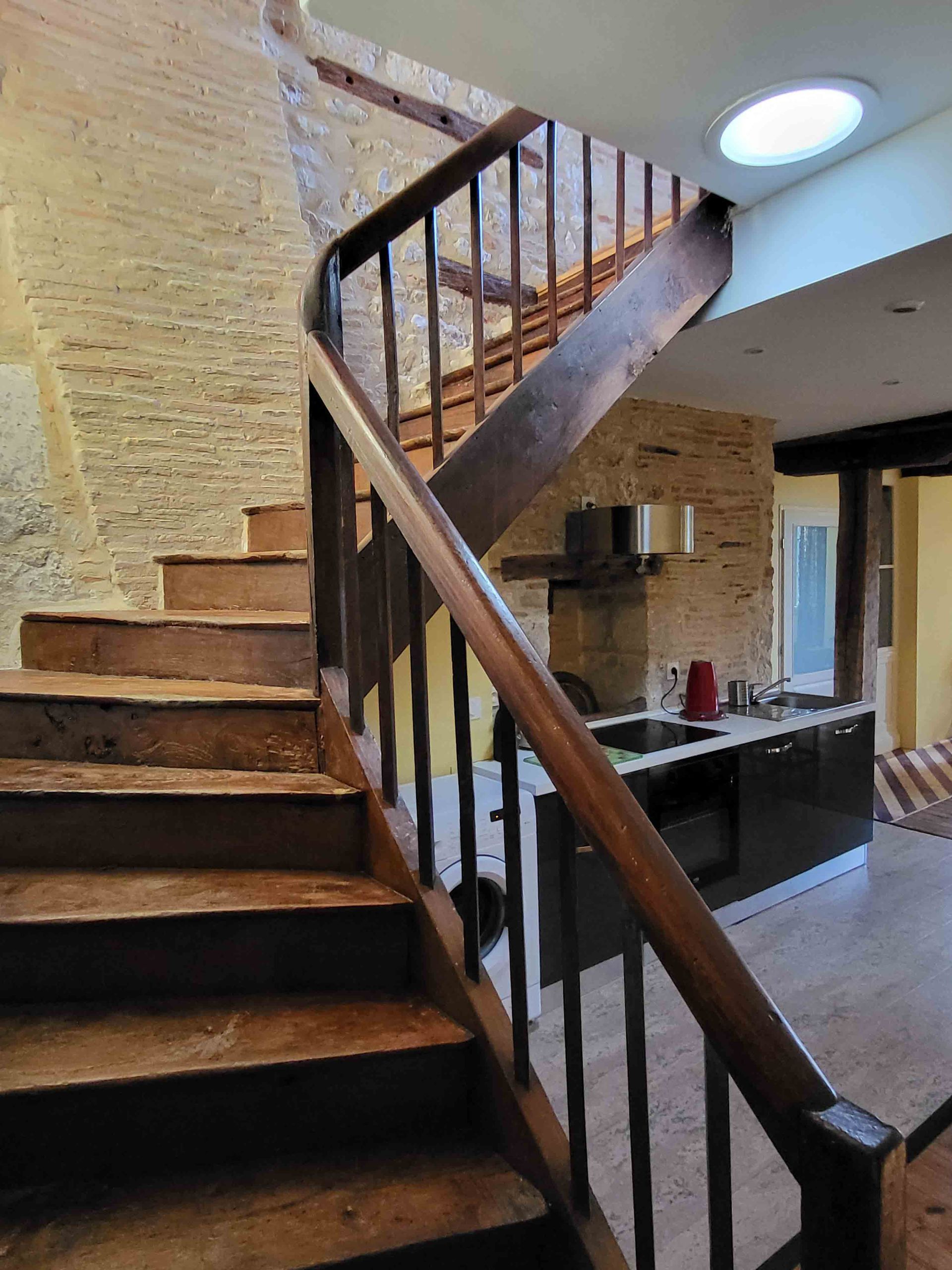 This house used to be a hotel restaurant called ‘Boule’ and the living room upstairs was once the Saturday night haunt for Villereal dancing. Today the access to this area is by a gracious staircase from the back alley up to the first floor which offers a living space with kitchen and dining area, one bedroom and a bathroom. The house has been sensitively renovated to provide all modern comforts but preserving and discovering many medieval features which add character and atmosphere. An old staircase leads up past a beautifully pointed wall with brick chimney flue to a second level with two bedrooms and bathroom and a small kitchen to accommodate life on the roof deck alongside. There are two double beds and the children’s room has two singles with additional truckle beds. The view out from the terrace is of old houses and the countryside beyond the town.