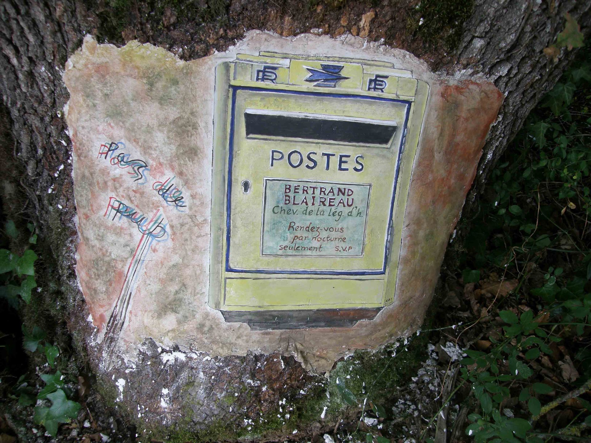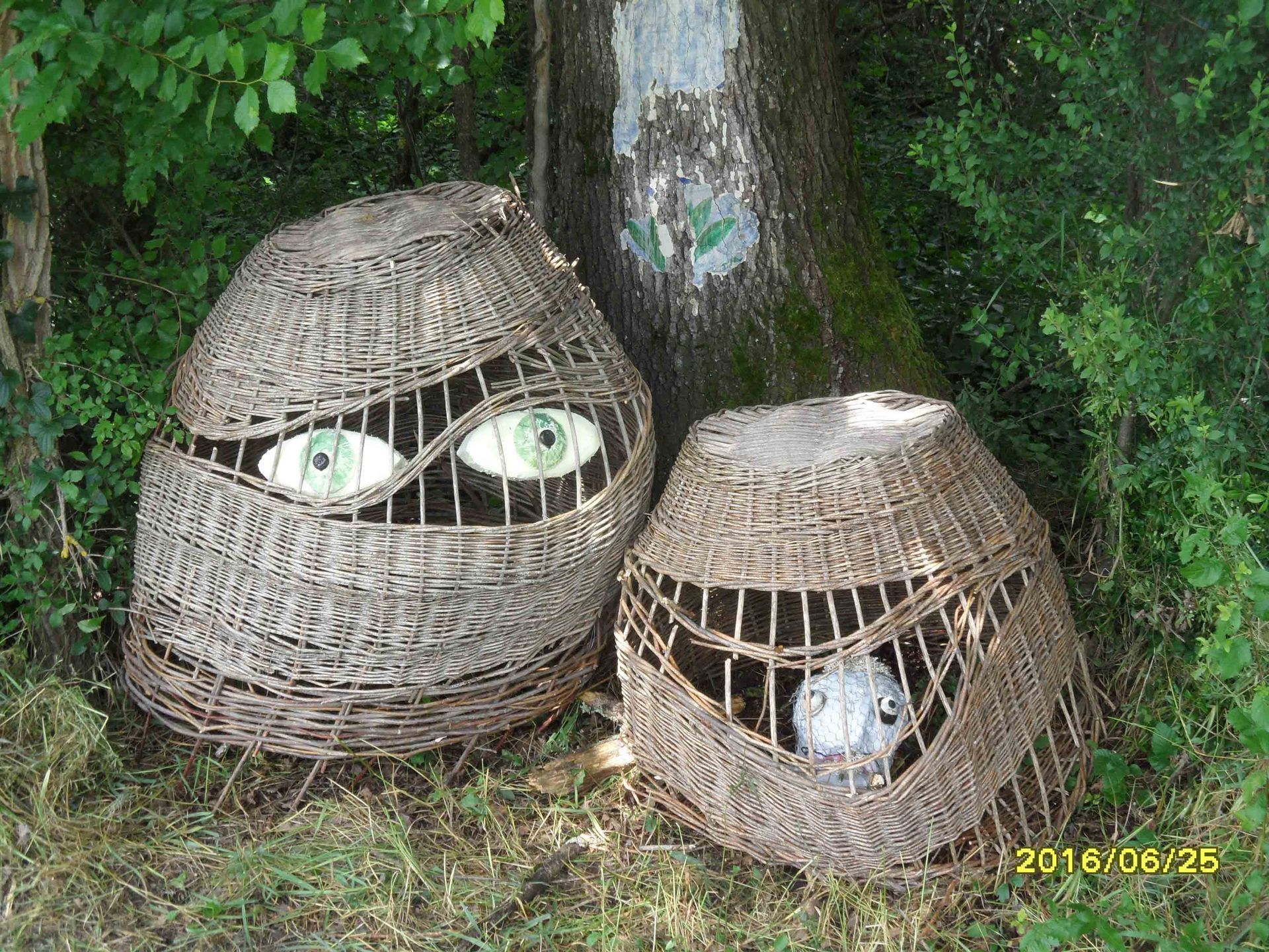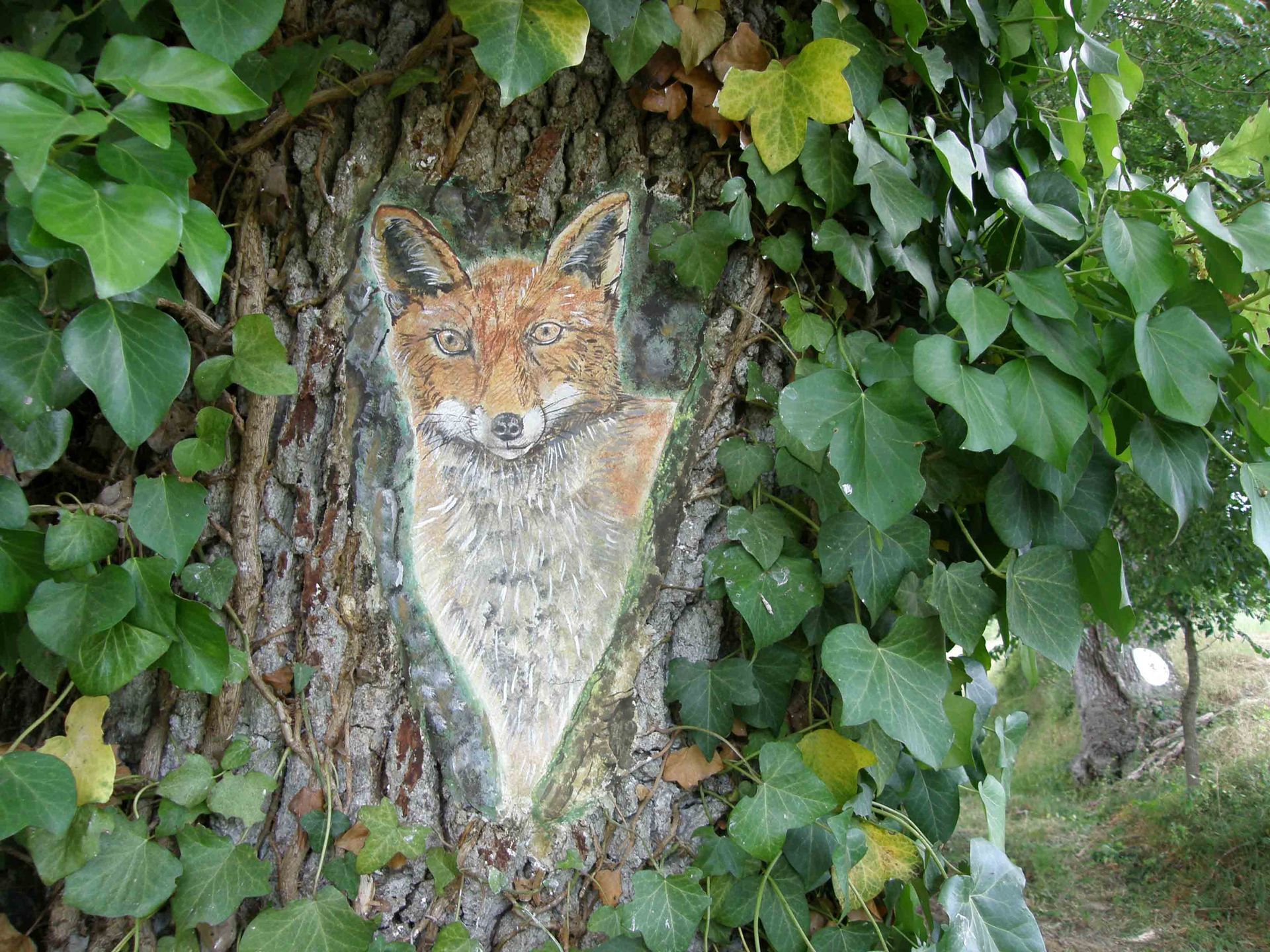 Fortuitously living near a town where the mayor wanted to cultivate the arts and promoted ‘Land’art’ in his community as a goal along with community gardens, Ann Mary came into contact with this association at the point where one walk path that had been decorated by paid professional artists was being extended to a walk path intended to be embellished by amateur artists and locals. In 2008 Ann Mary tried a fresco of a little door on a tree in her own garden. It actually lasted two years. The image was sufficient for permission to put a large door on an old oak on the walk path in 2009 and this fresco is still there in pieces but greatly deteriorated. Subsequently Ann Mary was asked to take over as President of the Association which she ran for ten years, finally managing to pass on the mantle to somebody else. During those years, artists and artisans were paid if they shared expertise with the amateurs and specific projects were undertaken with the model of workshops to teach skills such as basket making, Didgeridoo painting on bamboo stems, frescoes on cement blocks in training and then trees, pottery cones for totem poles with decoration using themes of flora and fauna, dyeing fabrics with plants from the trail and using techniques to make pattern, then creating patchwork pieces for geometric frames for hanging outside. The amateurs themselves created many objects using corks from the region and the final project was finishing a metal horse sculpture made in concert with us by Amy Goodman in England.